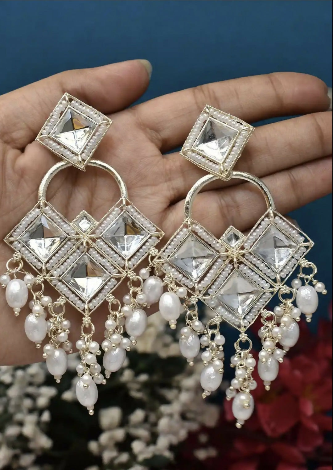Design: A multi-layered crescent frame filled with delicate white seed pearls that leads to a traditional bell-shaped Jhumki.