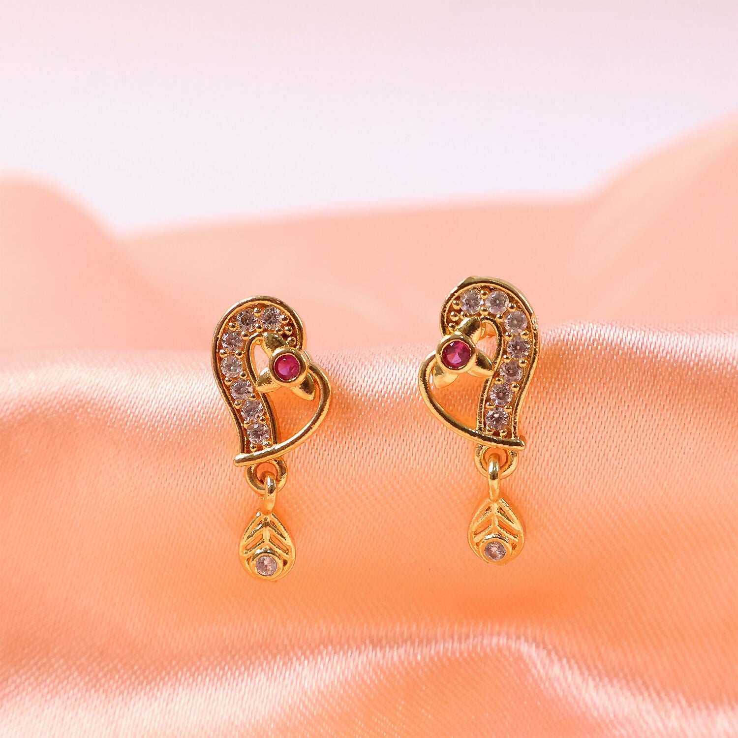 These elegant gold drop earrings feature a graceful paisley-inspired design, adorned with sparkling white stones and a rich ruby-colored accent at the center. The curved silhouette is highlighted by delicate stone detailing, while a small dangling drop adds movement and charm. Crafted to reflect timeless traditional artistry, these earrings blend classic sophistication with a modern finish—perfect for festive occasions, weddings, or ethnic wear styling.